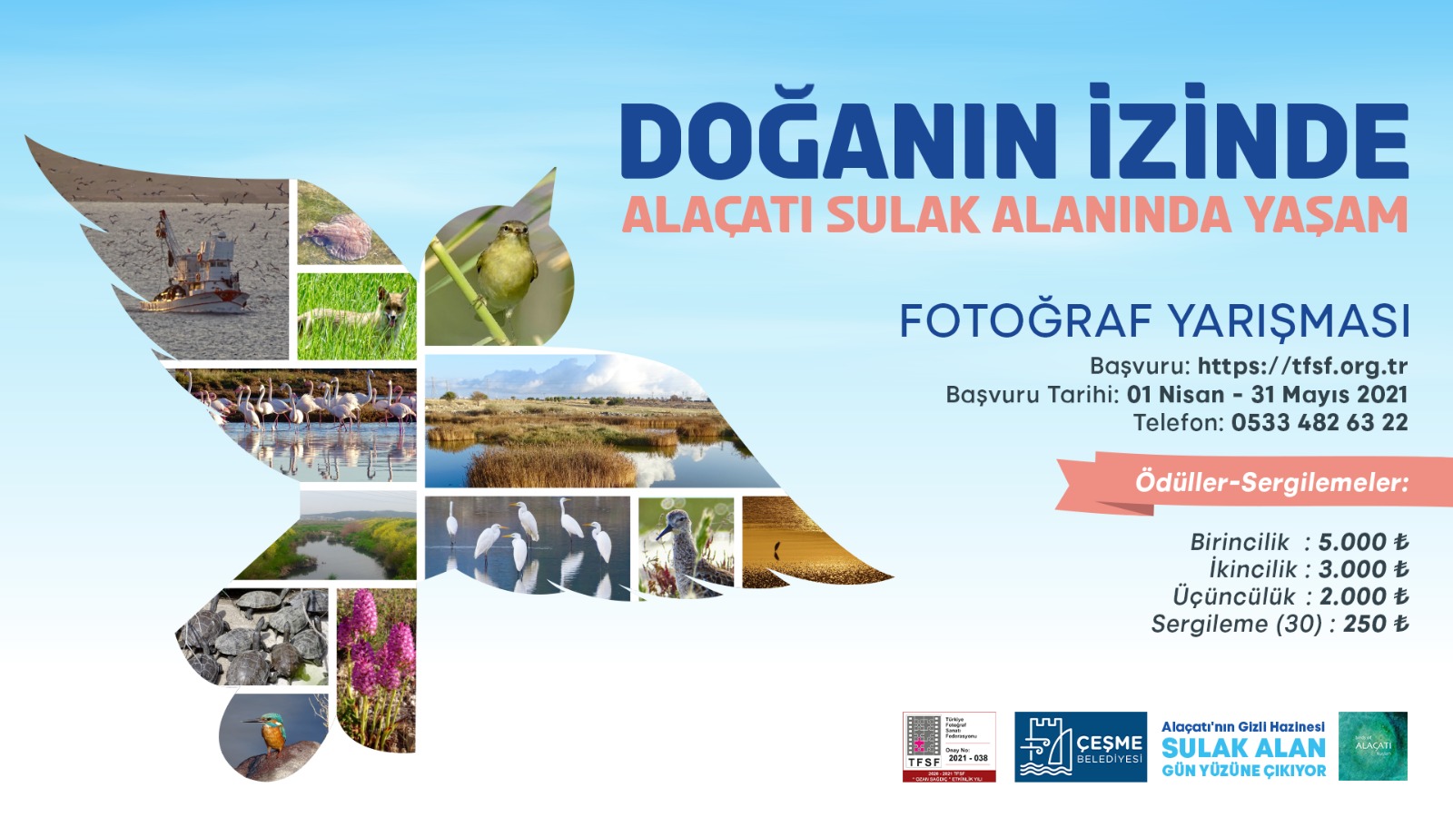 düzenlenen Alaçatı Sulak Alanı'nın zengin tabiatını, Alaçatı'nın doğal güzelliklerini yansıtan özgün fotoğraflarınızla katılabileceğiniz "Doğanın İzinde-Alaçatı Sulak Alanında Yaşam” başlıklı fotoğraf yarışmasına son başvuru tarihi 31 Mayıs 2021.