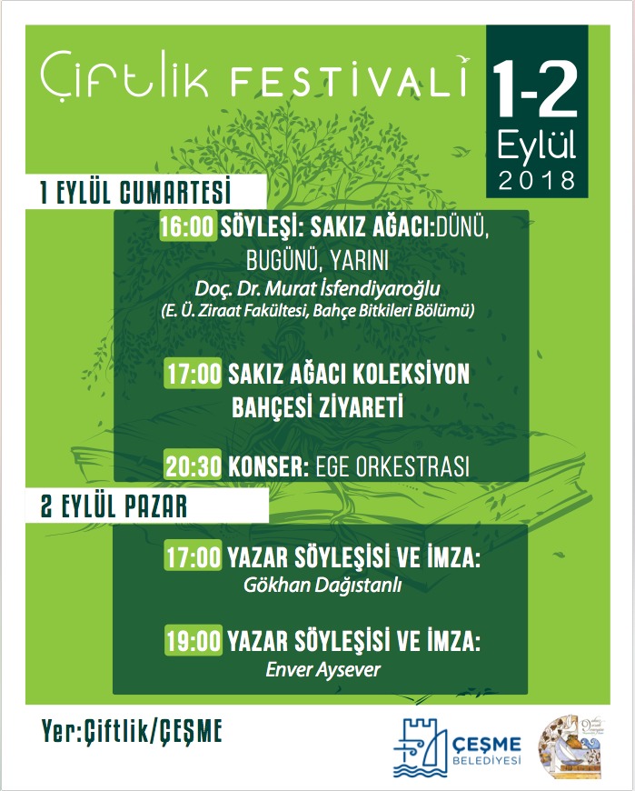 Çeşme Belediyesi tarafından bu yıl birincisi düzenlenecek Çiftlik Festivali'nin ilk gününde, Ege Üniversitesi Ziraat Fakültesi Bahçe Bitkileri Bölümü Öğretim Üyesi Doç. Dr. Murat İsfendiyaroğlu, saat 16.00'da, "Sakız ağacı; dünü, bugünü, yarını" başlıklı bir söyleşi gerçekleştirecek.