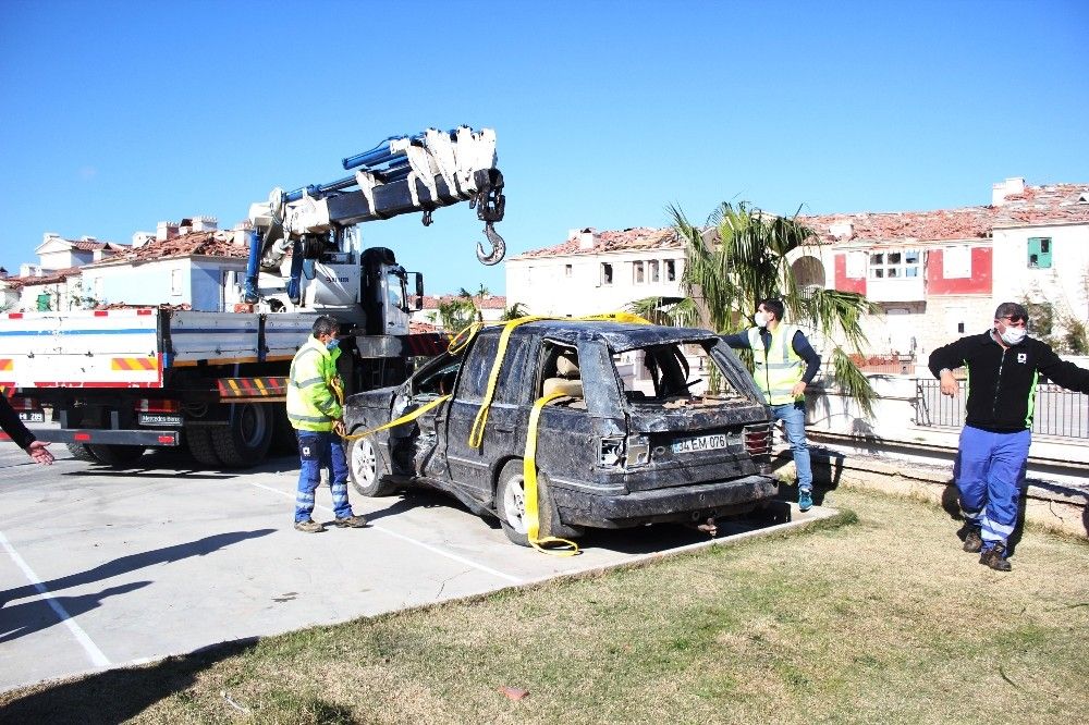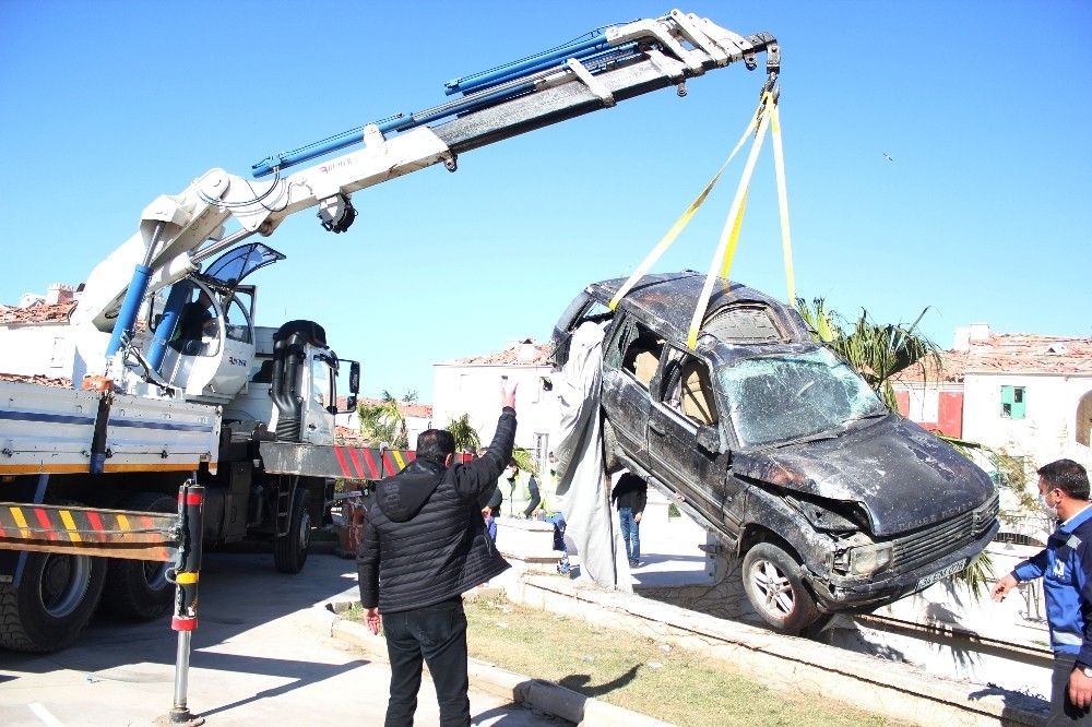 İzmir Çeşme'nin Alaçatı Mahallesi'nde dün akşam saatlerinde yaşanan hortum felaketinin yaraları sarılmaya çalışılırken, hortumun etkisiyle savrulan araçlar vinç yardımıyla oldukları yerlerden çıkarıldı.