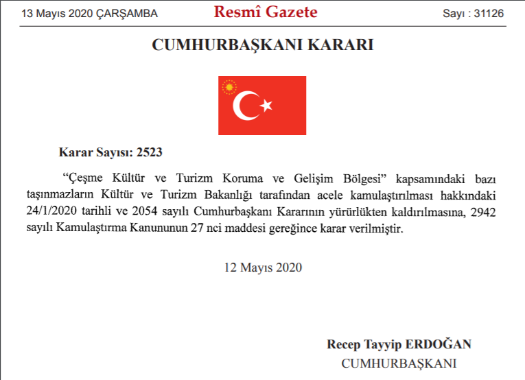 Geçen Ocak ayında kamuoyunda tartışmalara konu olan ve Turizm Bakanı Mehmet Nuri Ersoy’un “Orayı Cannes yapacağız” projede yeni bir gelişme yaşandı. 24 Ocak 2020 tarihli Çeşme Kültür ve Turizm Koruma ve Gelişim Bölgesi’ndeki bazı taşınmazların Kültür ve Turizm Bakanlığı tarafından acele kamulaştırılmasına yönelik karar ise yürürlükten kaldırıldı.