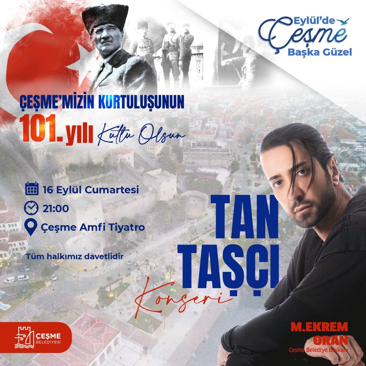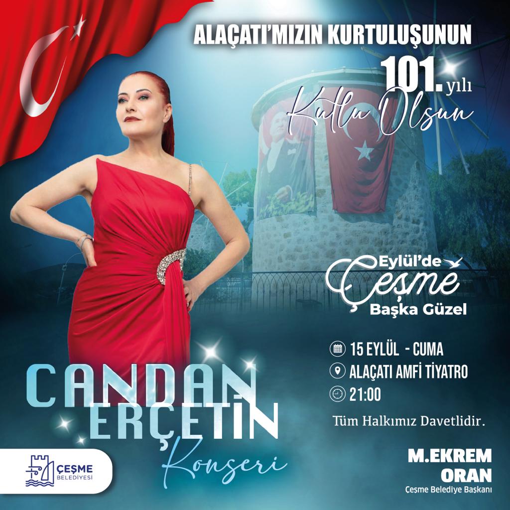 Çeşme Belediyesi, 15 Eylül Alaçatı ve 16 Eylül Çeşme'nin düşman işgalinden kurtuluşunun 101. yılını büyük bir coşkuyla kutlayacak. Türk pop müziğinin sevilen isimlerinden Candan Erçetin ve Tan Taşçı’nın sahne alacağı etkinliklere tüm vatandaşları davet eden Çeşme Belediye Başkanı M. Ekrem Oran, “Gelin Çeşme ve Alaçatı’nın kurtuluşunu hep birlikte kutlayalım, Çeşme tarihinin en görkemli kutlaması olacak” dedi.