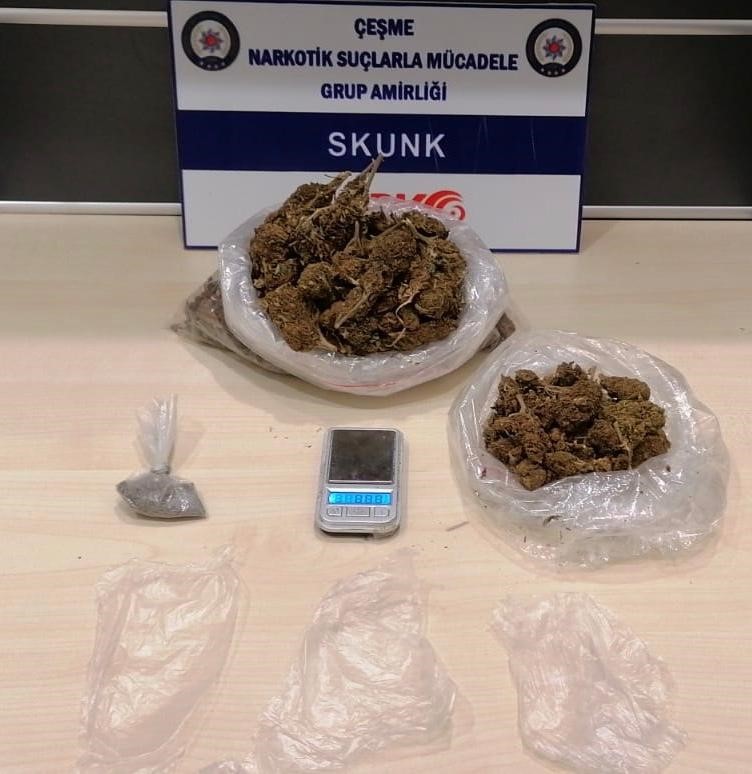 Edinilen bilgiye göre, NARKO Çeşme Grup Amirliği ekipleri, uyuşturucu ile mücadele kapsamında yaptıkları çalışma sonucunda, Çeşme'ye uyuşturucu madde satmak amacıyla geldikleri değerlendirilen F.V., K.D. ve B.Ş. adlı zanlıları, düzenlenen operasyonla yakaladı. Zanlıların kullandıkları araç içerisinde arama yapan ekipler, 135 gram esrar maddesi ele geçirdi. Zanlıların kaldıkları otel odasında da arama yapan NARKO ekipleri, uyuşturucu madde ticaretinde kullanıldığı değerlendirilen 1 adet hassas terazi, parçalanmış şekilde şeffaf poşetler ve 1,5 gram daha esrar maddesi ele geçirerek el koydu.