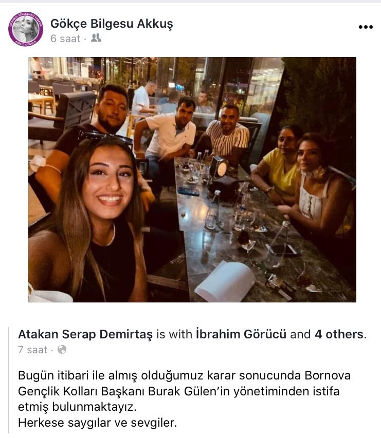 Gökçe Bilgesu Akkus haberi sosyal medya hesabından “Bugün itibari ile almış olduğumuz karar sonucunda Bornova Gençlik Kolları Başkanı Burak Gülen’in yönetiminden istifa etmiş bulunmaktayız. Herkese saygılar ve sevgiler” notu ile duyurdu.