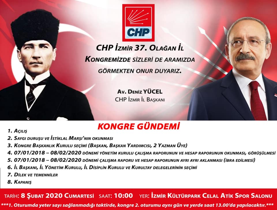 ‘’Cumhuriyet Halk Partisi İzmir İl Başkanlığımızın, 37. Olağan İl Kongresi tarihi, 8 Şubat 2020 Cumartesi günü olarak belirlenmiştir. Kongremizin partimize, İzmir’e ve Türkiye’ye hayırlı olmasını diliyor, tüm üyelerimizi ve İzmirli vatandaşlarımızı, 8 Şubat Cumartesi günü, saat 10.00’da, Kültürpark Celal Atik Spor Salonu’nda yapılacak olan kongremize davet ediyorum.”