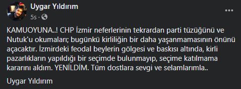 KAMUOYUNA..! CHP İzmir neferlerinin tekrardan parti tüzüğünü ve Nutuk'u okumaları; bugünkü kirliliğin bir daha yaşanmamasının önünü açacaktır. İzmirdeki feodal beylerin gölgesi ve baskısı altında, kirli pazarlıkların yapıldığı bir seçimde bulunmayıp, seçime katılmama kararını aldım. YENİLDİM. Tüm dostlara sevgi ve selamlarımla..