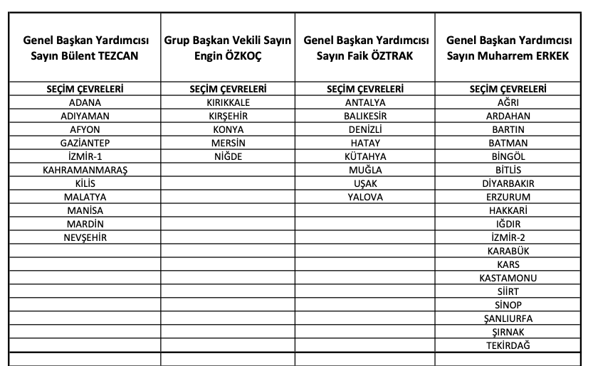 Cumhuriyet Halk Partisi (CHP) Merkez Yönetim Kurulu (MYK) seçim takvimi yol haritasını belirlemek üzere Genel Başkan Kemal Kılıçdaroğlu başkanlığında toplandı.Toplantıda aday adayları başvurularını değerlendirme konusunda önemli bir karar alındı ve 8 kişilik komisyon kuruldu. Komisyonda; chp Genel Sekreteri Selin Sayek Böke, CHP TBMM Grup Başkanvekili Engin Özkoç, CHP Parti Sözcüsü Faik Öztrak, CHP Genel Başkan yardımcıları Veli Ağbaba, Onursal Adıgüzel, Oğuz Kaan Salıcı, Muharrem Erkek, Bülent Tezcan yer aldı.Öte yandan komisyon kentleri paylaşırken İzmir'de sorumlu olacak isimler de belli oldu.Buna göre komisyonda İzmir 1.Bölge'den Bülent Tezcan, 2.Bölge'den ise Muharrem Erkek sorumlu olacak.