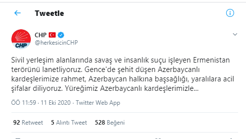 CHP'den yapılan açıklamada Ermenistan'ın sivillere saldırısı lanetlendi.