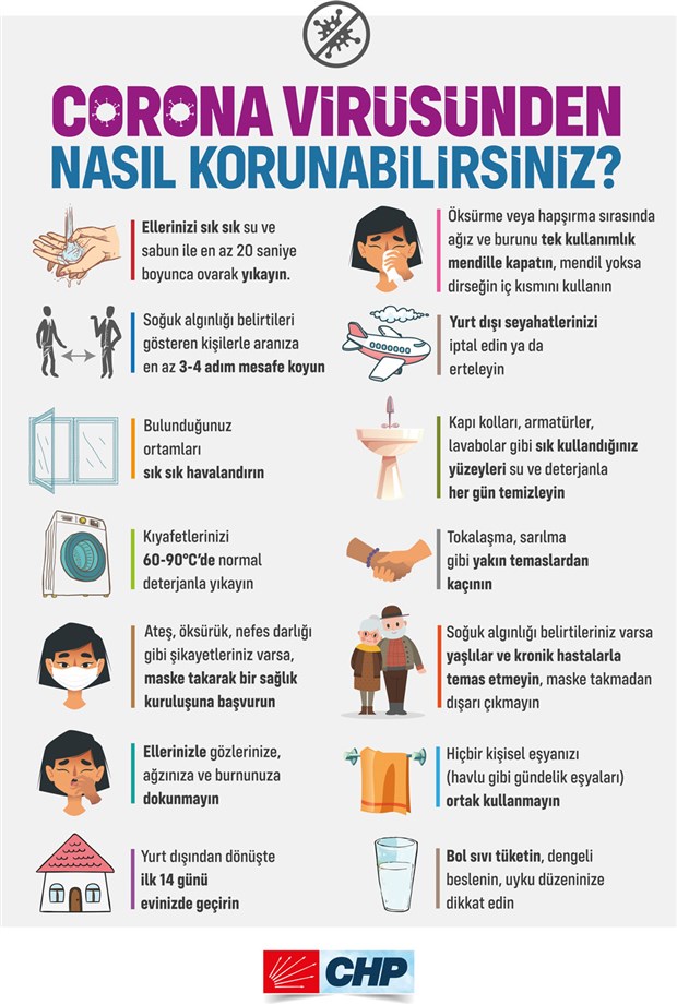 Cumhuriyet Halk Partisi (CHP) yeni tip koronavirüsten (Covid-19) korunma yolları ile ilgili bilgilendirme afişleri ve el broşürleri hazırlayarak il ve ilçe başkanlıklarına gönderdi.