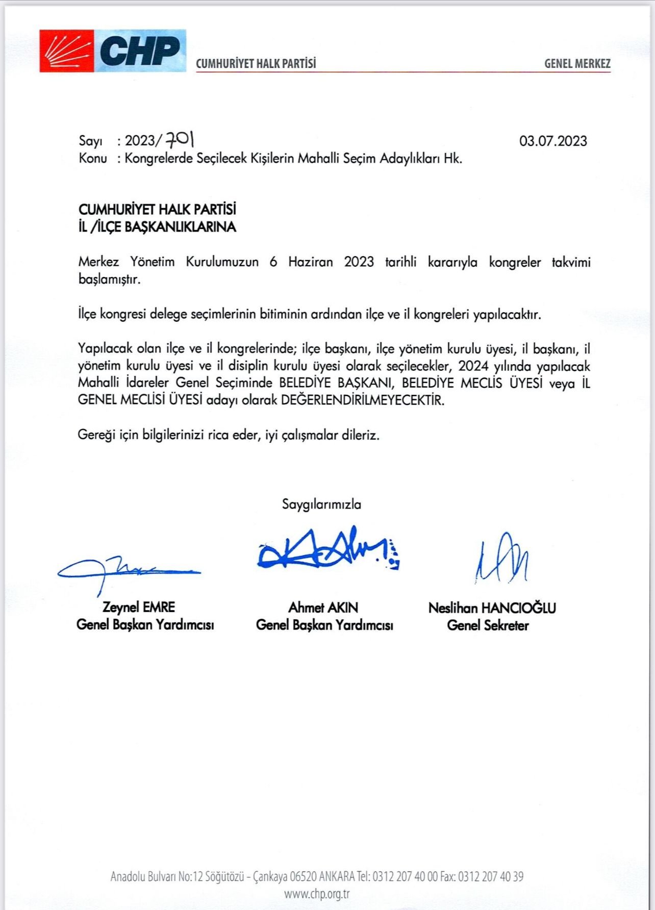CHP’de büyük kurultay takvimi işlemeye başladı. Partililer delegeleri belirlemeye başladı. Ağustos ayında ilçe kongreleri başlayacağı ana muhalefet partisinde, önemli bir genelge yayınlandı. Genel Başkan Yardımcıları Zeynel Emre, Ahmet Akın ve Neslihan Hancıoğlu’nun imzası ile yayınlanan genelgede şöyle denildi:“Merkez Yönetim Kurulumuzun Haziran 2023 tarihli kararıyla kongreler takvimi başlamıştır. İlçe kongresi delege seçimlerinin bitiminin ardından ilçe ve il kongreleri yapılacaktır. Yapılacak olan ilçe ve il kongrelerinde; ilçe başkanı, ilçe yönetim kurulu üyesi, il başkanı, il yönetim kurulu üyesi ve il disiplin kurulu üyesi olarak seçilecekler, 2024 yılında yapılacak Mahalli İdareler Genel Seçiminde BELEDİYE BAŞKANI, BELEDİYE MECLİS ÜYESİ veya İL GENEL MECLİSİ ÜYESİ adayı olarak DEĞERLENDİRİLMEYECEKTİR. Gereği için bilgilerinizi rica eder, iyi çalışmalar dileriz”