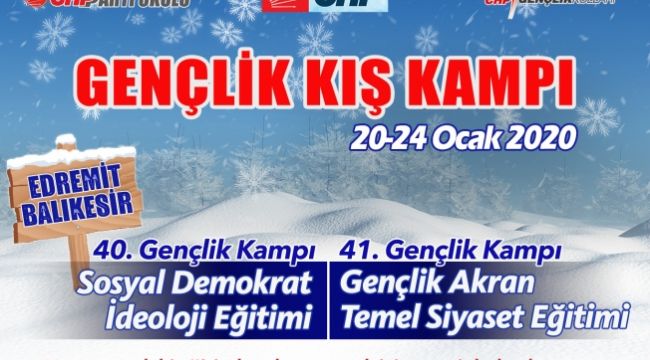 Bu sene 41. düzenlenen Cumhuriyet Halk Partisi'nin Gençlik Kış Kampı başvuruları başladı. 20-24 Ocak 2020 tarihleri arasında Balıkesir Edremit’te gerçekleştirilecek olan CHP 41. Gençlik Kış Kampı başvuruları alınmaya başlandı.