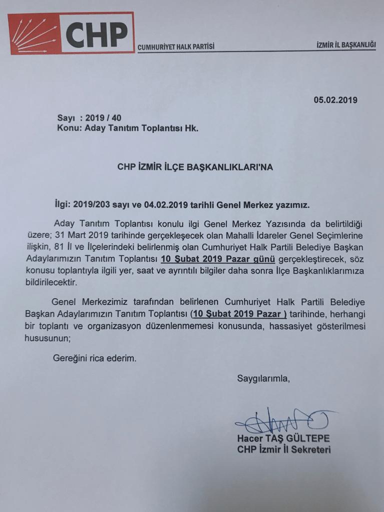 Yeri ve saati henüz netleşmeyen belediye başkan adayı tanıtım toplansı için il başkanlıklarına gönderilen bir yazıda 10 Şubat tarihinde hiçbir örgütün ve adayın organizasyon yapmaması uyarısında bulunuldu. chp İzmir İl Sekreteri Hacer Taş imzasıyla ilçe başkanlıklarına gönderilen, genel merkez uyarısını içeren yazıda, “Aday tanım toplansı konulu ilgi genel merkez yazısında da belirldiği üzere, 31 Mart 2019 tarihinde gerçekleşecek olan Mahalli İdareler Genel Seçimlerine ilişkin, 81 il ve ilçelerindeki belirlenmiş olan Cumhuriyet Halk Parli belediye başkan adaylarımızın tanım toplansı 10 Şubadt 2019 Pazar günü gerçekleşrilecek, söz konusu toplanyla ilgili yer, saat ve ayrınlı bilgiler daha sonra ilçe başkanlıklarımıza bildirilecekr. Genel merkemizim tarandan belirlenen Cumhuriyet Halk Parli belediye başkan adaylarımızın t anım toplansı 10 Şubat Pazar tarihinde, herhangi bir toplan ve organizasyon düzenlenmemesi konusunda, hassasiyet gsöterilmesi hususunun gereğini rica ederim” ifadeleri kullanıldı.