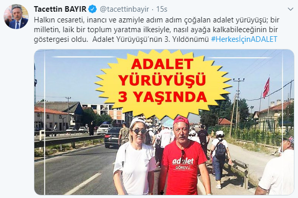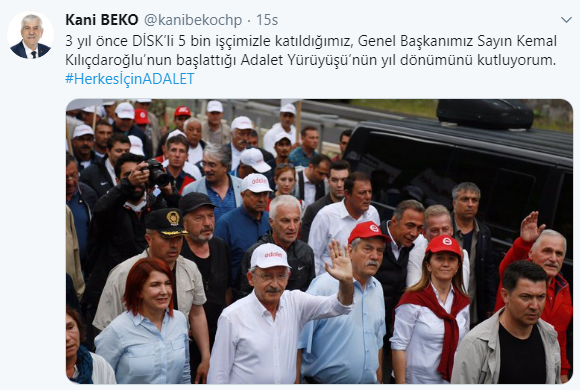 3 yıl önce DİSK’li 5 bin işçimizle katıldığımız, Genel Başkanımız Sayın Kemal Kılıçdaroğlu’nun başlattığı Adalet Yürüyüşü’nün yıl dönümünü kutluyorum. #HerkesİçinADALET