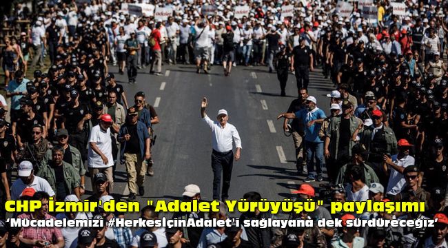 Oktay Güçtekin / İzmir Gündemi - Cumhuriyet Halk Partisi Genel Başkanı Kemal Kılıçdaroğlu tarafından 2017 yılında başlatılan “Adalet Yürüyüşü” üzerinden üç yıl geçti. Ankara’dan başlayan ve İstanbul’a kadar devam eden yürüyüşe Cumhuriyet Halk Partililer’in yanı sıra bir çok vatandaşta katılmıştı. Yaklaşım 450 km yolun yüründüğü yürüyüş 3’üncü yaşında da unutulmadı.Cumhuriyet Halk Partisi İzmir örgütü “Adalet Yürüyüşü”nün 3’üncü yılını sosyal medya üzerinden yaptıkları paylaşım ile gündeme getirdi. chp İzmir İl Başkanı deniz yücel başta olmak üzere birçok CHP İzmir Milletvekili kişişel sosyal medya hesaplarından paylaşımlarda bulundu. #HerkesİçinAdalet etiketi ile yapılan paylaşımlarda yürüyüşün tarihe geçtiği vurgulandı.