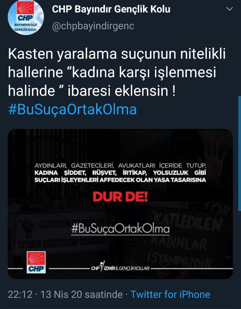 CHP Bayındır Gençlik Kolları; Kasten yaralama suçunun nitelikli hallerine "Kadına karşı işlenmesi halinda" ibaresi eklensin!