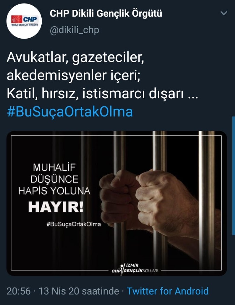 CHP Dikili Gençlik Kolları; Avukatlar, gazeteciler, akedemisyenler içeri; Katil, hırsız, istismarcı dışarı...