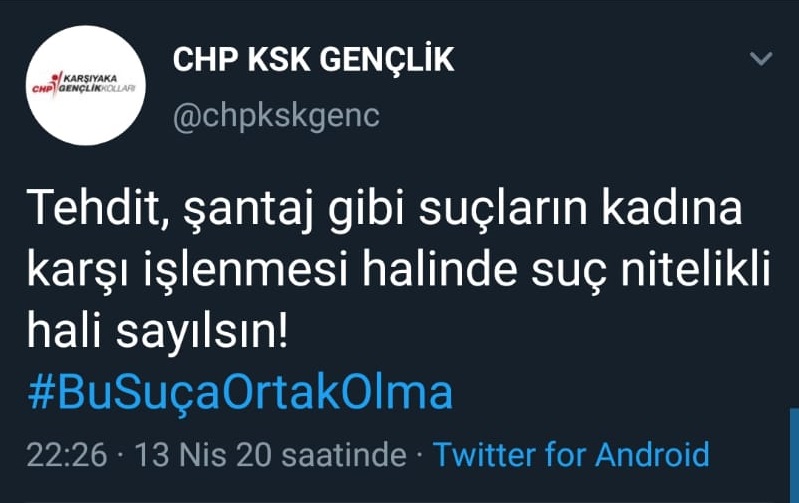 CHP Karşıyaka Gençlik Kolları; Tehdit, şantaj gibi suçların kadına karşı işlenmesi halinde suç nitelikli hali sayılsıl!