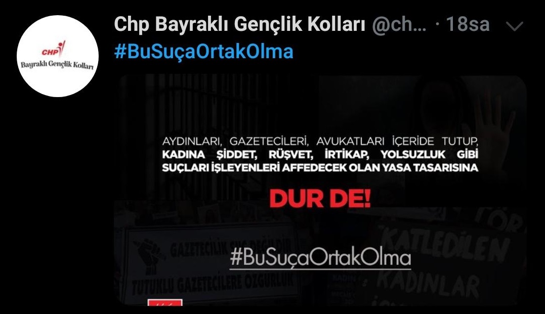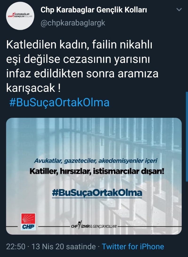 CHP Karabağlar Gençlik Kollar; Katledilen kadın, failini nikahlı eşi değilse cezasının yarısını infaz edildikten sonra aramıza karışacak!