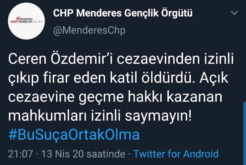 CHP Menderes Gençlik Kolları; Ceren Özdemi'i cezaevinden izinli çıkıp firar eden katil öldürdü. Açık cezaevine geçme hakkı kazanan mahkımları izinli saymayın!
