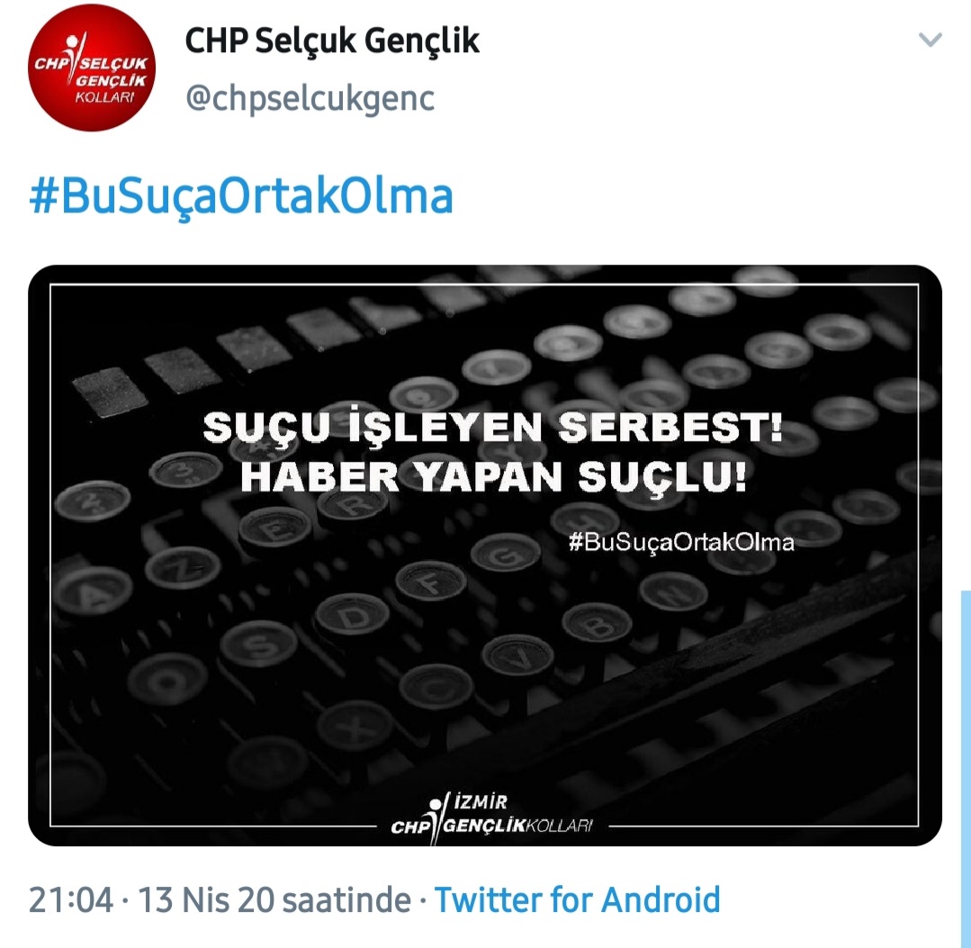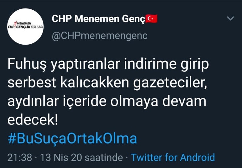 CHP Menemen Gençlik Kolları; Fuhuş yaptıranlar indirime girip serbest kalıcakken gazeteciler, aydınlar içeride olmaya devam edecek!