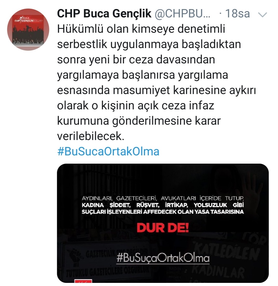CHP Buca Gençlik Kolları; Hükümlü olan kimseye denetimli serbestlik uygulanmaya başladıktan sonra yeni bir ceza davasından yargılamaya başlanırsa yargılama esnasında masumiyet karinesine aykırı olarak o kişinin açık ceza infaz kurumuna gönderilmesine karar verilebilecek.