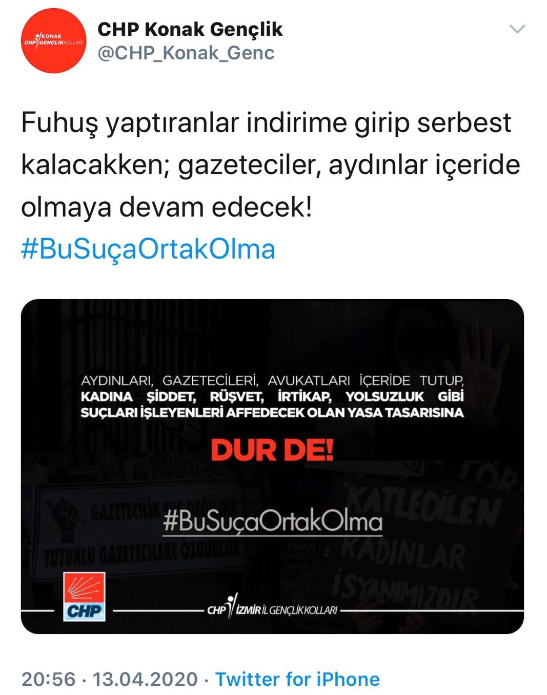 CHP Konak Gençlik Kolları; Fuhuş yaptıranlar indirime girip serbest kalacakken; gazeteciler,aydınlar içeride olmaya devam edecek!