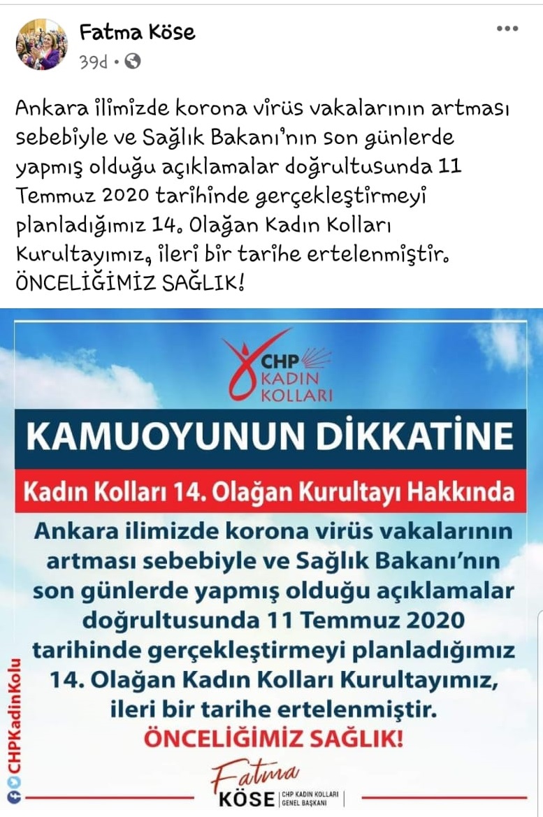 CHP Kadın Kolları Genel Başkanı Fatma Köse 11 Temmuz tarihinde yapıllması planlanan Kadın Kolları Genel Başkanlık seçimi ile ilgili önemli bir paylaşım yaptı. Sosyal medya hesabından seçimlerin Ankara'da artan koronavirüs vakaları nedeniyle iptal edildiğini duyurdu. Köse'nin paylaşımının ardından ise gözler 25 Temmuz tarihinde yapılması planlanan Kurultayın iptal edilip edilmeyeceği sorusunu akılları getirdi. Genel Merkez'den henüz kurultay ile ilgili bir iptal bilgisi yayınlanmazken, kısa süre içerisinde açıklamanın gelmesi bekleniyor.