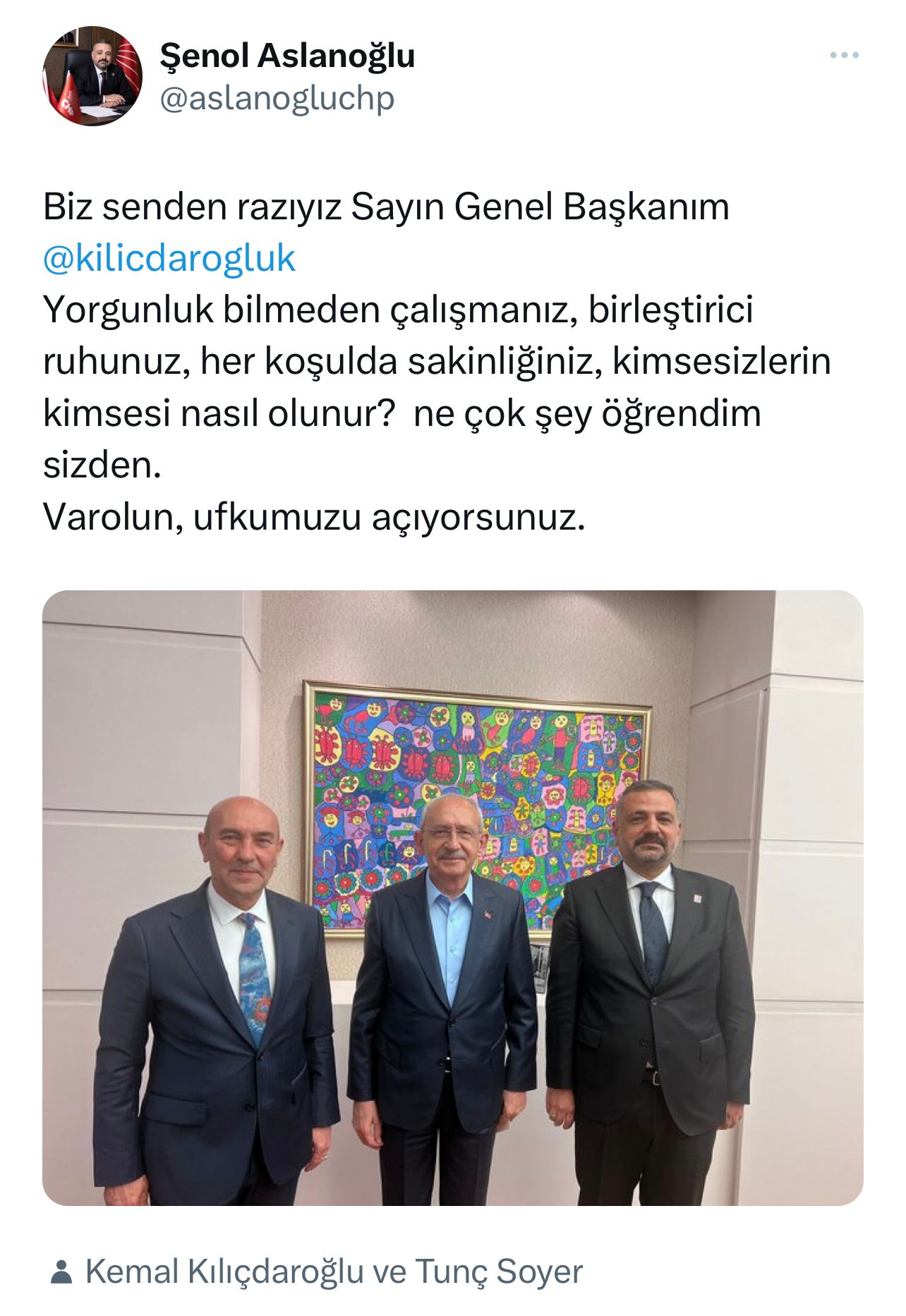 İZMİR GÜNDEMİ/ 28 Mayıs seçimlerinin ardından birçok siyasiden CHP Lideri Kemal Kılıçdaroğlu’na destek mesajları geliyor. İzmir’deki oyları yüzde 67’ye taşıyarak CHP Lideri Kemal Kılıçdaroğlu’na büyükşehirler arasında en yüksek desteği veren CHP İzmir’in il başkanı Şenol Aslanoğlu sosyal medyadan paylaşım yaptı.İzmir Büyükşehir Belediye Başkanı Tunç Soyer ile birlikte Ankara’ya giderek CHP Lideri Kemal Kılıçdaroğlu’nu ziyaret eden Aslanoğlu, ziyaret sonrası şunları söyledi; Biz senden razıyız Sayın Genel Başkanım @kilicdarogluk