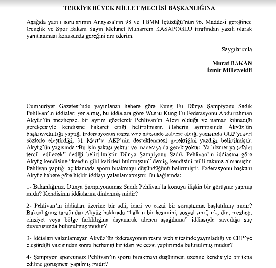 CHP İzmir Milletvekili Murat Bakan, dün basına yansıyan Dünya Şampiyonu Sporcu Sadık Pehlivan’ın iddialarını Gençlik ve Spor Bakanı’na sordu. Yazılı bir soru önergesiyle Pehlivan’ın iddialarının aslını soran Bakan, Wushu Kung Fu Federasyonu Başkanı Abdurrahman Akyüz için adli, idari ve cezai bir soruşturma açılıp açılmadığını sordu.