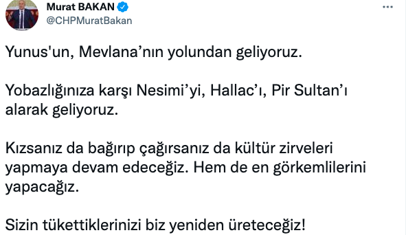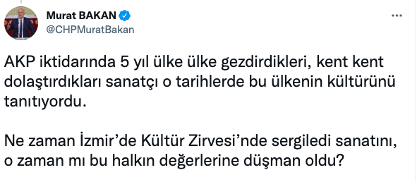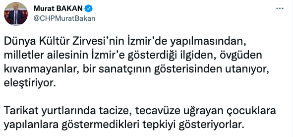 İZMİR GÜNDEMİ/ CHP İzmir Milletvekili Murat Bakan, İzmir'in dördüncüsüne ev sahipliği yaptığı Dünya Belediyeler Birliği Kültür Zirvesi’nin (UCLG) gala gecesindeki sanat ve dans gösterilerinin küçük bir bölümünü hedef alarak, ‘çıplak semazen’ başlığıyla İzmir Büyükşehir Belediye Başkanı Tunç Soyer’i de hedef göstererek paylaşım yapanları sert dille eleştirdi. CHP’li Bakan, “Kızsanız da bağırıp çağırsanız da kültür zirveleri yapmaya devam edeceğiz. Hem de en görkemlilerini yapacağız. Sizin tükettiklerinizi biz yeniden üreteceğiz!” dedi.