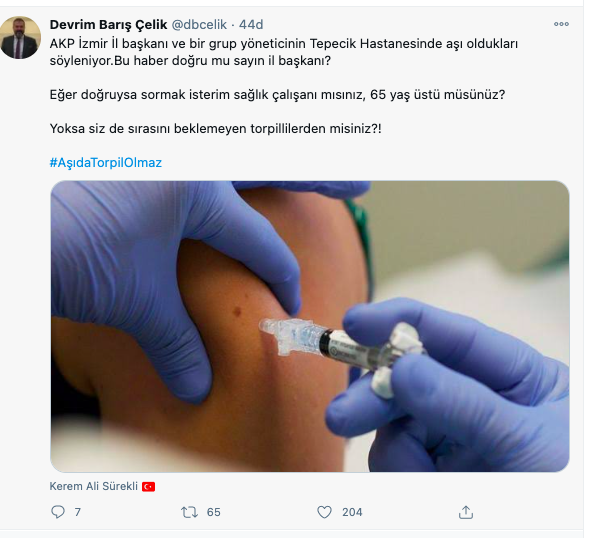 Çin'den getirilen Coronavac aşısında sağlık personelinin aşılanması sürerken, chp PM üyesi Devrim Barış Çelik'ten flaş bir iddia geldi. CHP'li Çelik, akp il başkanı ve yöneticilerinin Tepecik Eğitim ve Araştırma Hastanesi'nde aşı yaptıklarını iddia ederek Kerem Ali Sürekli'ye sosyal medya hesabından sordu.