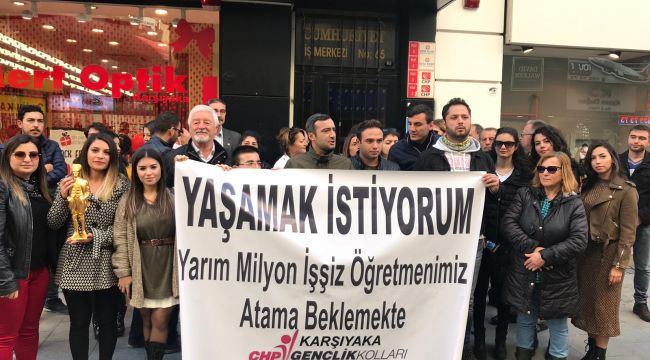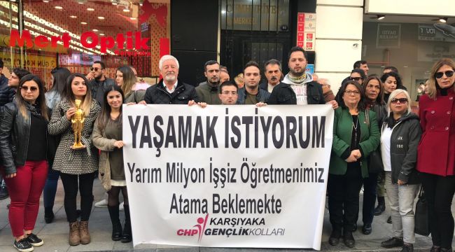 Basın açıklaması CHP Karşıyaka Gençlik Kolları Başkanı Uğur Emeş'in konuşmasıyla başladı. Ermeş, " Bugün burada atanamayan, atanamadığı için kendi yaşamına son veren öğretmenlerimiz de dahil olmak üzere tüm öğretmenlerimizi anmak için toplandık" diye açıkladı. Ermeş'in konuşmasından sonra CHP Karşıyaka Gençlik Kolları Başkan Yardımcısı Özenç Kalkan hazırladıkları basın metnini okudu. Kalkan, "Bizler Başöğretmen Mustafa Kemal Atatürk'ün evlatlarıyız. Mustafa Kemal'in milleti için yaptığı devrimlerden, en önem verdiği eğitimdi. Bunu kendisi her fırsatta dile getirmiş ve sözleri ile öğretmenlerin bir ülke için ne kadar önemli olduğunu vurgulamıştır. Atatürk ' Öğretmenler; Cumhuriyet sizden fikri hür, vicdanı hür, irfanı hür nesiller bekler' demiştir. Ama bugün fikri hür, vicdanı hür, irfanı hür nesiller yetişmesini istemeyen kişilerce öğretmenlerimizin önüne engeller koyulmuştur" diye konuştu. BU HAKSIZLIKLARI ASLA HAK ETMEDİLER!Kalkan toplanmanın amacını belirtirken, "Biz bu ülkeye, eli kalem tutan nesiller yetiştirmek için okuyan ancak siyasi çıkarlar sebebiyle haksızlığa uğrayan, evine ekmek götüremeyen, çocuğunu rahat yaşatamayan, en kötüsü de bu sebeplerle hayatını kaybeden öğretmenlerimiz için bu güzel günde açıklama yapma gereği duyduk. Onlar önlerine koyulan engelleri her defasında aşmaya çalıştılarİ, sabrettiler, yılmadılar... Hep yeniden ayağa kalktılar. yeri geldi olmayınca hayırlısı dediler hep yeniden kaybolmayan hayalleri ile kitaplarına sarıldılar. Hepimizi yetiştiren o güzel insanlar yapılan bu haksızlıkları asla hak etmediler" dedi.YARIM MİLYON ATANAMAYAN ÖĞRETMEN VARAyrıva Kalkan, "Atanamayan öğretmenlerimizin sayısı bugün yarım milyona dayanmıştır .Bu rakam olayın vehametini ortaya koymaktadır.KPSS adı altındaki hayal kırıklığı, çalınan sorular ,öne çıkan engeller öğretmenlerimiz ile birlikte tüm milletimizin sorun haline gelmiştir.Bugüne kadar atama sürecinde verilen sözlerin hiçbiri mevcut iktidar tarafından tutulmamıştır. Yapılan çözüm önerileri akla ve vicdana sığmamaktadır.Çözüm adı altındaki icraatler, bilimi eğitim sistemimizin ötesine itmiştir. Temelsiz ve çıkarcı bir eğitim anlayışının hüküm sürdüğü bir düzende eğitim sorununun üst raflardan düşmeyeceği yadsınamaz bir gerçektir"diye belirtti.KALICI ÇÖZÜMLER BEKLİYORUZKalkan konuşmasını, "Öğretmen atama kontenjanı arttırılmalıdır.Öğretmen açığı sözleşmeli öğretmenlerle değil atama bekleyen öğretmenlerin atanması ile kapatılmalıdır. Öğretmen atamalarında yapılan mülakat, sözleşmeli öğretmenlik gibi uygulamalar öğretmenlerin sorunlarına çare olmamakta, aksine daha büyük sorunlara neden olmaktadır.Bizler artık daha büyük sorunlara yol açan uygulamalar yerine öğretmenlerin sorunlarına kalıcı çözümler bekliyoruz. Sözleşme değil, kadro istiyoruz" diyerek sonlandırdı