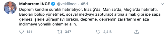 İnce sosyal medya hesabından yaptığı paylaşımda, "Deprem kendini sürekli hatırlatıyor. Elazığ’da, Manisa’da, Muğla’da hatırlattı. Baroları bölüp yönetmek, sosyal medyayı zapturapt altına almak gibi ipe sapa gelmez işlerle uğraşmayı bırakın, depreme, depremin zararlarını en aza indirmeye yönelik önlemler alın." ifadesini kullandı.