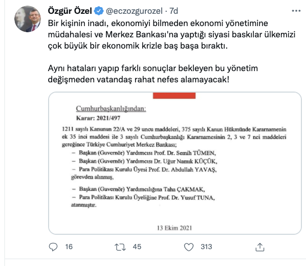 CHP Grup Başkanvekili Özgür Özel, merkez bankası yönetiminde iki başkan yardımcısı ile bir PPK üyesinin görevden alınmasına ilişkin olarak, "Bir kişinin inadı, Merkez Bankası'na yaptığı siyasi baskılar ülkemizi çok büyük bir ekonomik krizle baş başa bıraktı" değerlendirmesini yaptı. Özel Twitter hesabından yaptığı paylaşımda, "Bir kişinin inadı, ekonomiyi bilmeden ekonomi yönetimine müdahalesi ve Merkez Bankası'na yaptığı siyasi baskılar ülkemizi çok büyük bir ekonomik krizle baş başa bıraktı. Aynı hataları yapıp farklı sonuçlar bekleyen bu yönetim değişmeden vatandaş rahat nefes alamayacak!" ifadesini kullandı.
