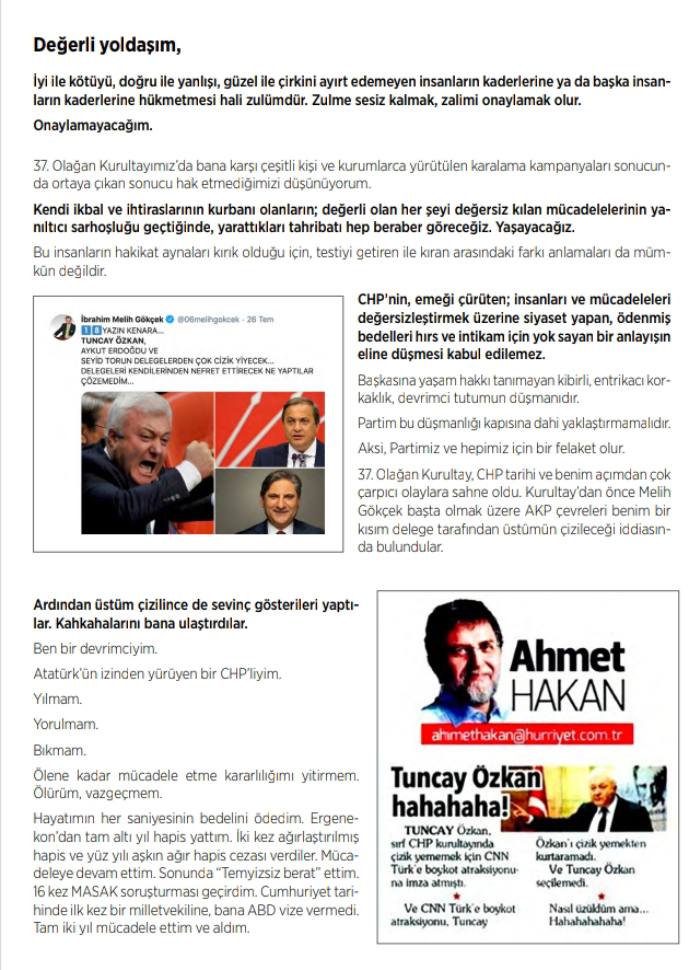 Hepsini partim bilmektedir. Şahsi çıkar ve ikbal peşinde koşmadım. Küçük hesapların, aç gözlü, komisyoncu siyasetin ve siyasetçilerin hep karşısında durdum. Şirketim, ticari faaliyetim, iş takibim, komisyonculuğum yoktur. Partim görev vermedikçe, Genel Başkan’ım istemedikçe kimseyle parti çıkarları dışında asla bir görüşmede bulunmam. Hiçbir kuruma gitmem. Şimdi AKP’nin canını yakıyorum diye irin medyalarının karalamalarını, yalanlarını ya da geçmişten taşıdıkları kin ve intikam hislerini, iftiralar içinde gidermek istiyorlar. Bunların yalanlarını, içimizde bazı gözü dönmüşlerin yayışlarını üzülerek izliyorum. Ben bir mücadele adamıyım. Beni yeni tanımıyorsunuz. 35 yıl gazeteci, televizyoncu olarak sizler için mücadele ettim. Cumhuriyet Mitingleri’nden bu yana meydanları sizlerle doldurduk. Hiçbir zaman sizi ve kendimi utandırmadım. Utandırmam. Bunları da ilk kez söylüyorum. “Peki neden konuşmuyorsun? Neden televizyon gezip anlatmıyorsun Tüncay Özkan” diyenler var. Tam 2.5 yıldır televizyonlara çıkmadım. Demeç vermedim, TBMM kürsüsündeki konuşma hakkımı Anadolu’dan gelen genç milletvekillerimize bıraktım. CHP’nin eksiklerini gidermeye adadım kendimi. Aşk ile yaptım bu işi. Aşk, eksik gidermek değil midir? Çok ağır suçlamalarda bile partimi tartıştırmamak için sustum. A Haber, CNN gibi kanallara, kurumsal kimliğimize saldırdıkları için, Genel Başkanımız’a yakışıksız ve uygunsuz davrandıkları için yüz vermedim, mücadele ettim. Adımı kirletmek için her şeyi yaptılar. Yapıyorlar.İŞTE O MEKTUP