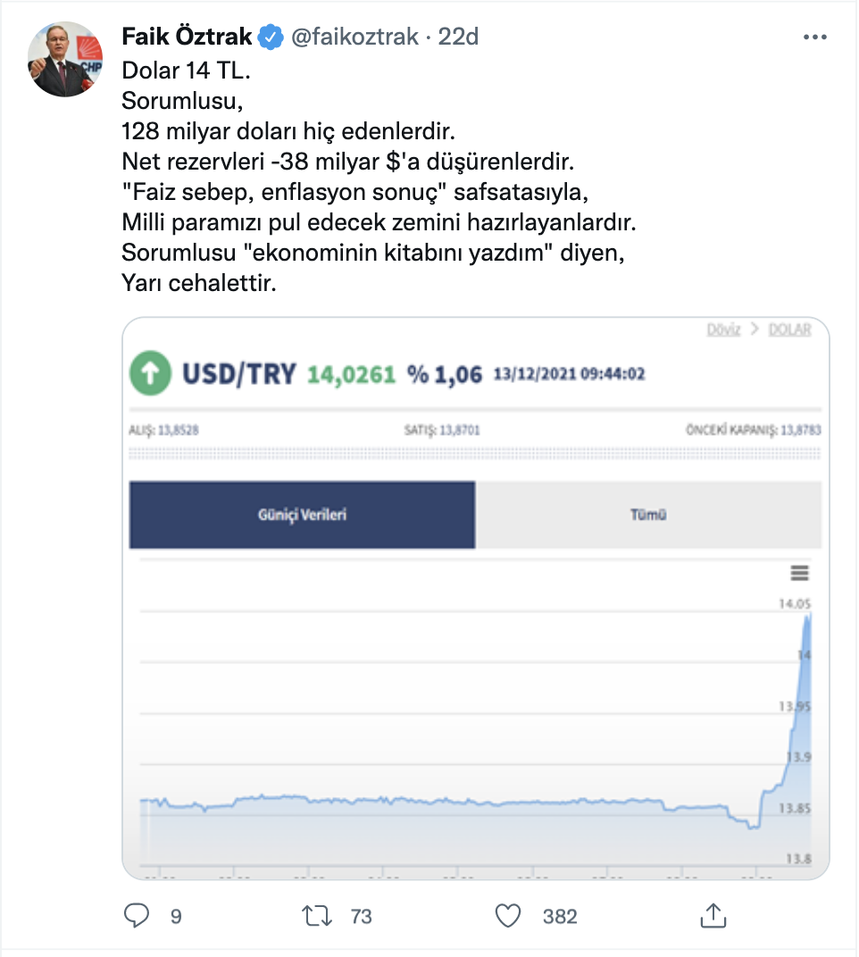 CHP Sözcüsü Faik Öztrak, dolar kurundaki yükselişe dikkat çekerek, "Sorumlusu 'ekonominin kitabını yazdım' diyen yarı cehalet" değerlendirmesini yaptı. Öztrak Twitter hesabından yaptığı paylaşımda, "Dolar 14 TL. Sorumlusu, 128 milyar doları hiç edenlerdir. Net rezervleri -38 milyar $'a düşürenlerdir. "Faiz sebep, enflasyon sonuç" safsatasıyla, Milli paramızı pul edecek zemini hazırlayanlardır. Sorumlusu "ekonominin kitabını yazdım" diyen, Yarı cehalettir." ifadesini kullandı.