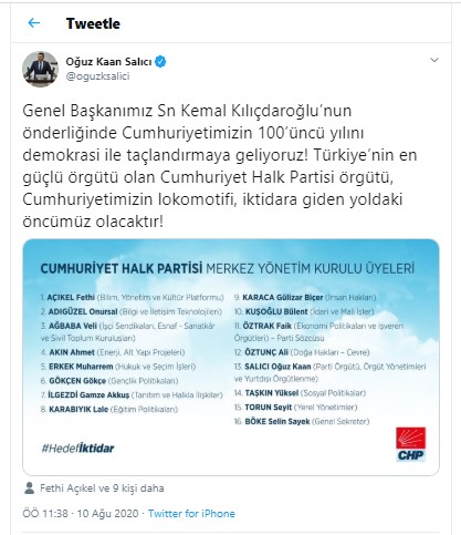 Parti örgütlerini yeniden Oğuz Kaan Salıcı'ya teslim eden Kılıçdaroğlu, Parti Sözcülüğünde de Faik Öztrak ile devam kararı aldı. CHP'nin A Takımı'nın belli olmasının ardından Oğuz Kaan Salıcı sosyal medya hesabından açıklama yaptı.