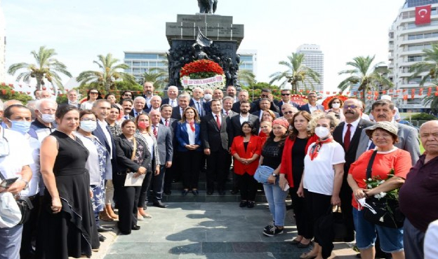 CHP İzmir İl Başkanlığı'nın Cumhuriyet Meydanı'nda düzenlediği törene chp İzmir İl Başkan Deniz Yücel, CHP İzmir milletvekilleri Mahir Polat, Murat Bakan, Bedri Serter, Atila Sertel, Kani Beko, Sevda Erdan Kılıç, ilçe belediye başkanları ve partililer katıldı.