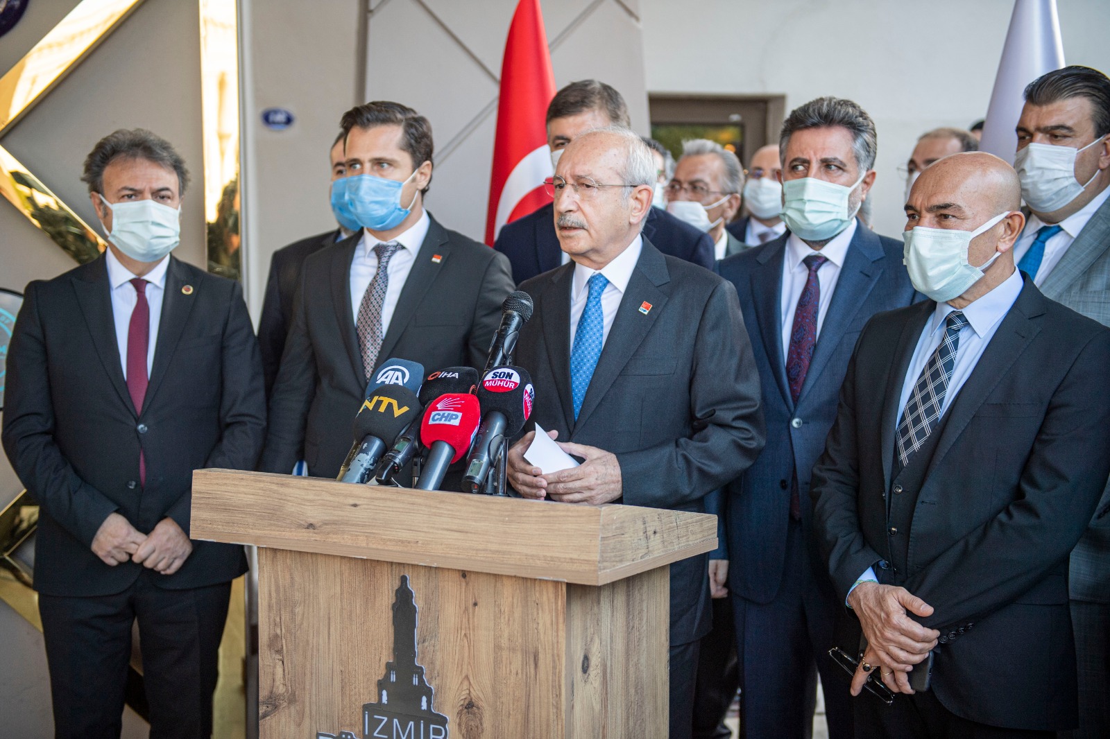 Açıklamaya CHP İzmir İl Başkanı Deniz Yücel ile ilçeleri depremden etkilenen Bayraklı Belediye Başkanı Serdar Sandal, Bornova Belediye Başkanı Mustafa İduğ, Seferihisar Belediye Başkanı İsmail Yetişkin ve ilçe belediye başkanları da katıldı.