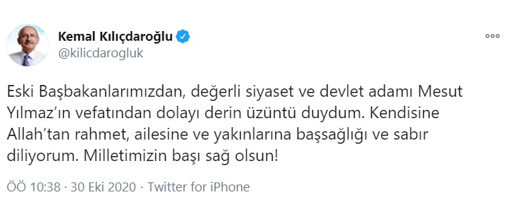 "Eski Başbakanlarımızdan, değerli siyaset ve devlet adamı mesut Yılmaz’ın vefatından dolayı derin üzüntü duydum.