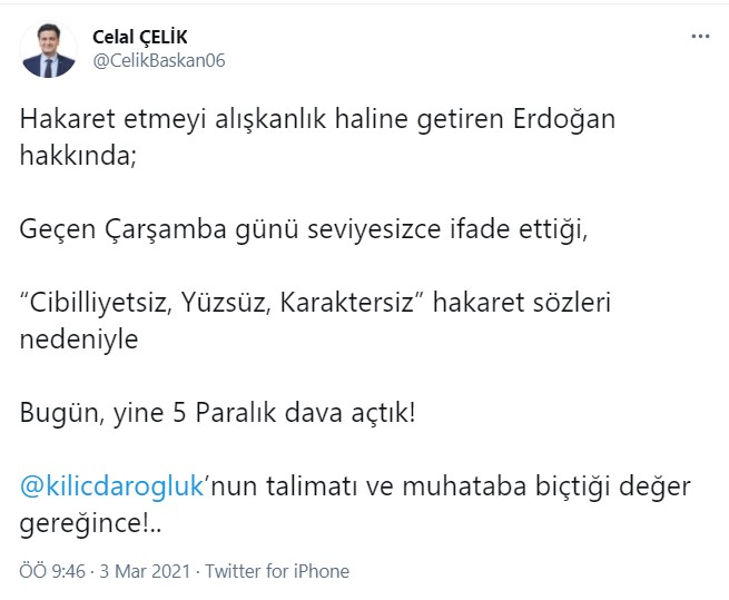 AKP'li cumhurbaşkanı Recep Tayyip erdoğan geçen hafta partisinin frup toplantısında yaptığı konuşmada chp ve İYİ Parti'yi hedef alarak "Cibilliyetsiz, Yüzsüz, Karaktersiz" ifadelerini kullanmıştı. CHP Genel Başkanı Kemal Kılıçdaroğlu'nun avukatı Celal Çelik sosyal medya hesabı Twitter üzerinden yaptığı paylaşımla Cumhurbaşkanı Erdoğan hakkında hakaretleri nedeniyle '5 paralık'