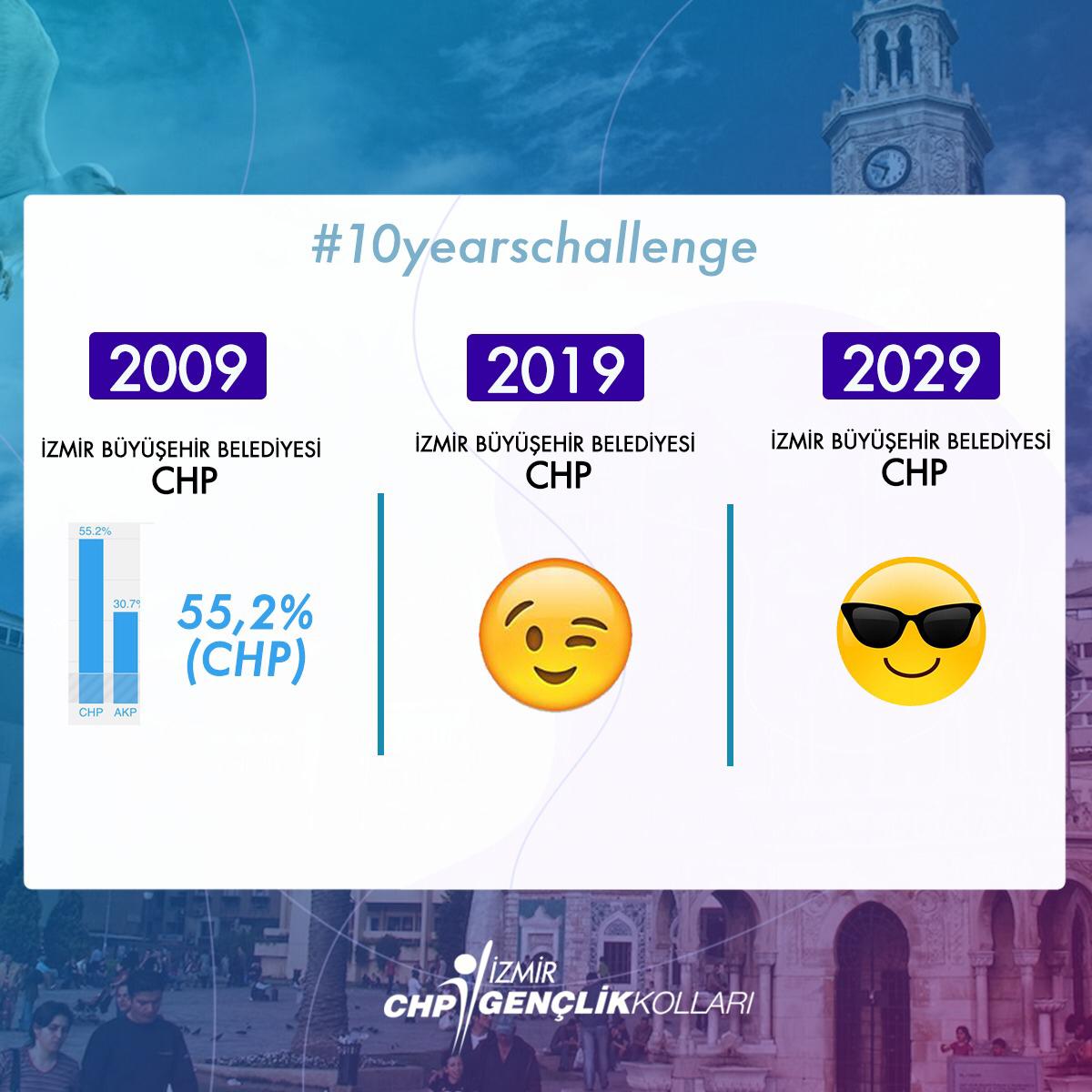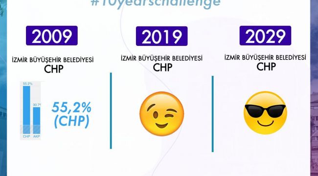 Sosyal medyada son günlerde popüler olan #10YearChallenge akımı devam ediyor. chp İzmir Gençlik Kolları tarafından hazırlanan görselde yaklaşan yerel seçimler öncesi İzmir Büyükşehir Belediyesi'nin 2009'da olduğu gibi 2019'da da CHP'de kalacağına vurgu yapıldı. Gençlik Kolları Başkanı Ozan Uyan da sosyal medya hesabından görseli şu mesajla paylaştı;