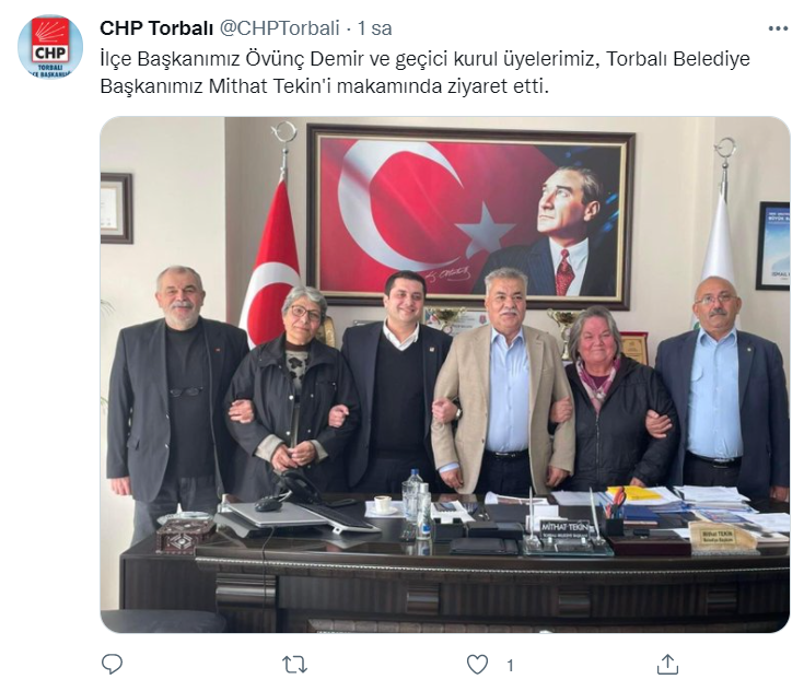 CHP Torbalı İlçe Başkanı Demir fotoğrafı, El ele, kol kola, omuz omuza…Kıymetli Belediye Başkanımız Sayın Mithat Tekin’i Cumhuriyet Halk Partisi Geçici Kurul Üyelerimiz ile birlikte ziyarette bulunduk" mesajıyla paylaştı.