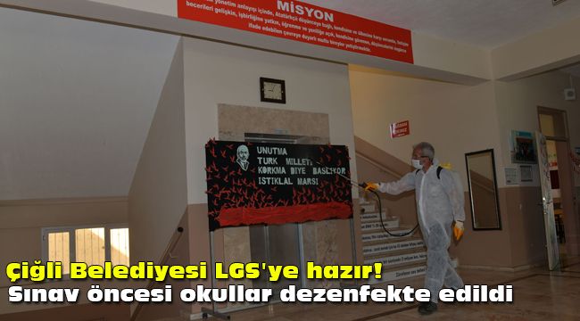 Küresel salgınla mücadele sürecinin başarılı bir şekilde sürdürüldüğü Çiğli’de, LGS’ye ev sahipliği yapacak okullarda Belediye Temizlik İşleri Müdürlüğüne bağlı ekipler detaylı dezenfekte çalışmaları gerçekleştirdi. Sınavlara girecek öğrenciler ve sınav yerinde görevli personellerin sağlığını korumak amacıyla gerçekleştirilen çalışmalar kapsamında, okul bahçeleri, banklar, okul koridorları, sınıflar, kapı kolları ve tuvaletler dezenfektan ile temizlendi.