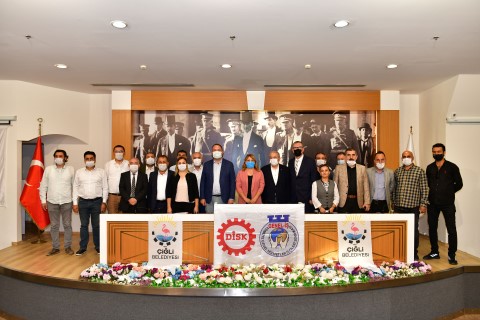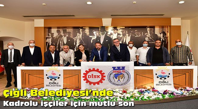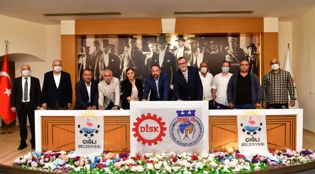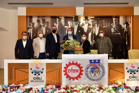 Çiğli Belediyesi’nin kadrolu işçilerini ilgilendiren TİS, Çiğli Belediye Başkanı utku Gümrükçü, Genel-İş Sendikası Genel Sekreteri Şükret Sevgener, DİSK Ege Bölge Temsilcisi Memiş Sarı, Genel-İş Sendikası 8 Nolu Şube Başkanı Deniz Şahin Gümüştekin tarafından belediye meclis salonunda düzenlenen törenle imzalandı. Sözleşmeye göre kadrolu işçilerin ücretlerinde yüzde 14 oranında artış sağlandı.