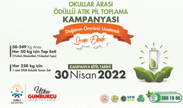 Çiğli sınırları içerisinde bulunan anaokulları, ilkokullar, ortaokullar ve liselere yönelik başlatılan Atık pil toplama Kampanyası ile atık pilleri kaynağında ayrıştırarak çevreye zarar vermeyecek şekilde bertaraf etmek, öğrencilere çevre bilincini aşılamak ve daha temiz ve yaşanabilir bir çevreye sahip olmak amaçlanıyor. kampanya boyunca; 50 ile 249 kg atık pil toplayan okullara her 50 kg atık pil için içerisinde 1 adet futbol topu, 1 adet basketbol topu ve 1 adet voleybol topunun yer alacağı Top Seti hediye edilecek. 250 kg atık pil toplayan okullar ise 1 adet STEM Robotik Sistem Seti ile ödüllendirilecek. 30 Nisan 2022 tarihine kadar devam edecek olan kampanya kapsamında toplanan piller Çiğli Belediyesi tarafından TAP’a teslim edilecek. Ödül töreni 2022-2023 eğitim öğretim yılının başında gerçekleştirilecek.