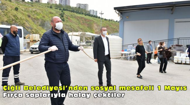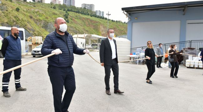 olası teması engellemek için Başkan Gümrükçü ve işçiler ellerindeki fırça saplarının birer uçlarını