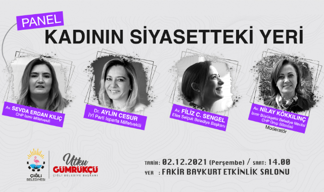 Kadın ve Aile Hizmetleri Müdürlüğü'nün organize edeceği “Kadının Siyasetteki Yeri” konulu panel, 2 Aralık Perşembe günü saat 14:00'de Fakir Baykurt Etkinlik Salonu’nda gerçekleştirilecek. İzmir Büyükşehir Belediye Meclisi CHP Grup Sözcüsü Av. Nilay Kökkılınç'ın moderatörlüğünde düzenlenecek etkinliğe, CHP İzmir Milletvekili Av. Sevda Erdan Kılıç, İYİ Parti Isparta Milletvekili Dr. Aylin Cesur ve Efes Selçuk Belediye Başkanı Av. Filiz Ceritoğlu Sengel konuşmacı olarak katılacak.