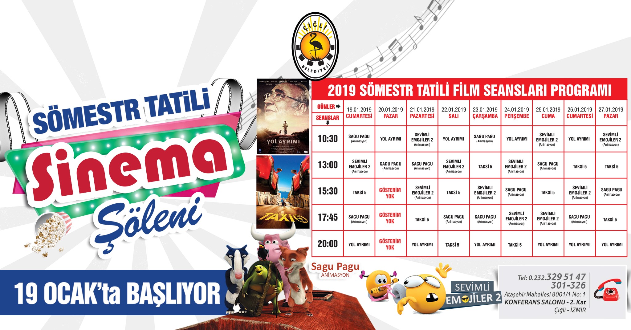 Çiğli Belediyesi geleneksel hale gelen sömestr sinema şöleni ile birbirinden güzel ve eğlenceli filmlerle Çiğli’de yaşayan çocuk ve gençlere şölen tadında bir tatil programı sunmaya hazırlanıyor. Filmler 19 Ocak Cumartesi gününden itibaren belediye konferans salonunda ücretsiz olarak izlenebilecek. Gösterilecek filmler arasında; Sagu Pagu, Sevimli Emojiler, Taksi 5 ve Yol Ayrımı yer alıyor. 9 gün boyunca filmler her gün 10.30, 13.00, 15.30, 17.45 ve 20.00 seanslarında izleyicisiyle buluşacak.