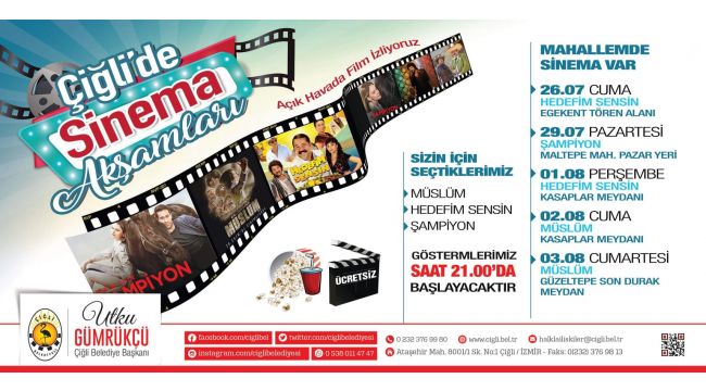 Çiğli Belediye Başkanı Utku Gümrükçü, sinemaya gitme fırsatı bulamayanlar için “Mahallemde sinema” etkinliği yaparak, vatandaşı sokaklara çıkaracaklarını söyledi. Çiğlili sinemaseverlerin, aileleri ve sevdikleriyle beraber keyifli vakit geçirme imkanı bulacağı bu etkinliğe halkı davet eden Başkan Gümrükçü, “Sıcak yaz akşamları için keyifli bir sinema etkinliği düzenledik. Son dönem filmlerini gösterime sunacağız. Ailelerimizin çocuklarıyla birlikte gelerek keyifli vakit geçirmelerini istiyoruz” dedi.