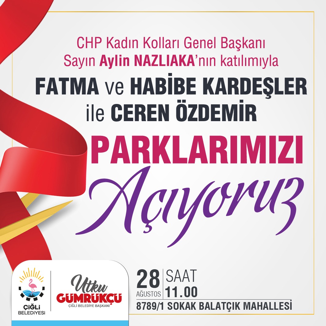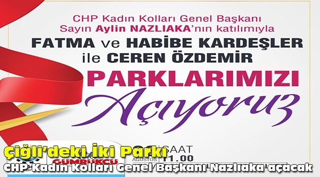 Çiğli belediyesi tarafından Köyiçi ve Balatçık mahallelerinde yapılan iki parkın açılışı, 9 Ağustos’ta chp Kadın Kolları Genel Başkanlığına seçilen aylin Nazlıaka tarafından gerçekleştirilecek. Sosyal mesafeli yapılacak açılış töreni, Ordu’da katledilen 20 yaşındaki balerin Ceren Özdemir’in adının verildiği Balatçık Mahallesi’ndeki parkta yapılacak. kadın Kolları Genel Başkanlığına seçilmesinin ardından ilk kez İzmir’e gelecek Nazlıaka, aynı anda Çiğli’de öldürülen kardeşler Fatma Akdağ ve Habibe Çevik’in adının verildiği Köyiçi’ndeki parkın açılışını da gerçekleştirecek.